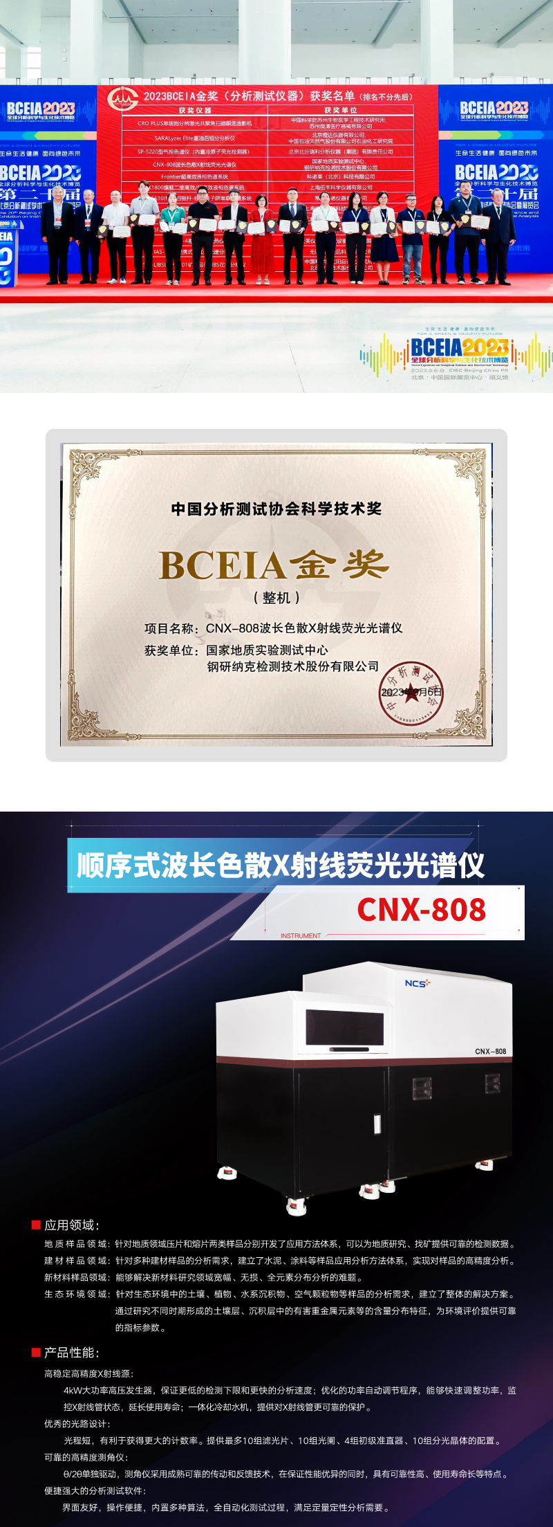 CNX-808顺序式波长色散X荧光光谱仪凭借其创新性、性能指标、社会效益和销售情况等方面的综合实力,在众多产品中脱颖而出,荣获中国分析测试协会科学技术奖BCEIA金奖。